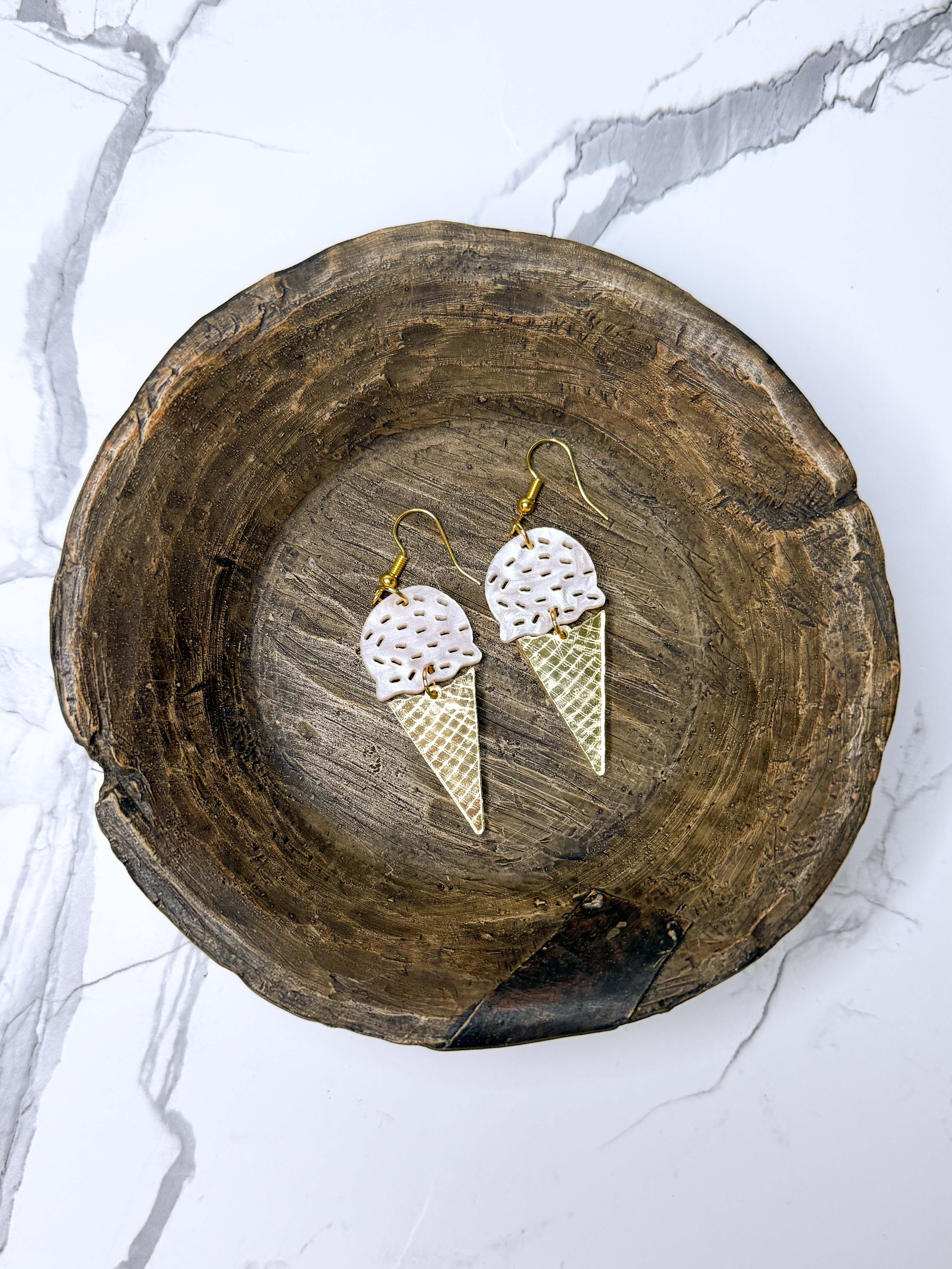 Ice Cream inspired Dangle Earrings with nickel free hardware designed and cut on our very own laser in Pink Swirl and Gold Mirror acrylic.